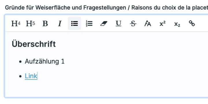 In den Chronologieeinträgen haben Sie in gewissen Textfeldern die Option, den Text zu formatieren (Überschriften, Listen und fett, kursiv, hochgestellt, etc.) sowie Links zu anderen Webseiten einzufügen. Um einen Link einzufügen, markieren Sie den gewünschten Text und klicken Sie auf das Kettensymbol ganz rechts. Die URL muss dabei zwingend mit http:// oder https:// beginnen, nur www.beispiel.ch führt zu einem Fehler beim Aufrufen der Seite. Am einfachsten kopieren Sie die URL direkt aus dem Browser.