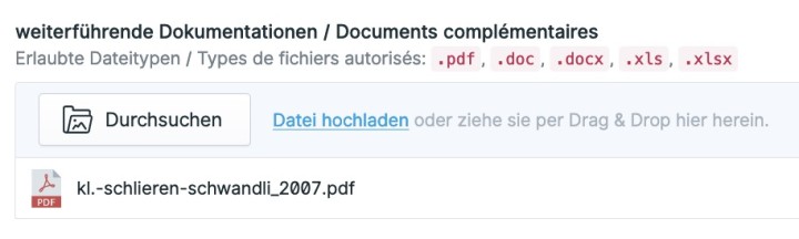 An verschiedenen Stellen können Sie Dateien auf SuisseNaiS hochladen und es wird jeweils angezeigt, welche Dateiformate erlaubt sind. Entweder können Sie die Datei über Datei hochladen auf ihrer Festplatte suchen oder sie aus dem Explorer/Finder per Drag & Drop hinzufügen.