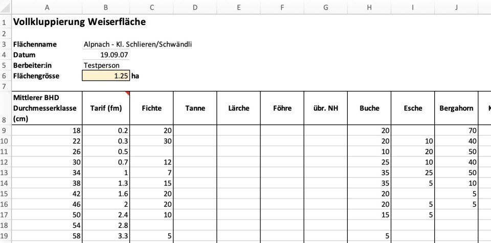 Durch das Hinterlegen eines Kluppierungsprotokolles einer Vollkluppierung. Daraus werden automatisch eine grafische Darstellung der Stammzahlverteilung nach Baumarten, sowie die Kennzahlen Stammzahl, Grundfläche, Vorrat (sofern im Protokoll ein Tarif hinterlegt wurde) und die Baumartenverteilung generiert. Damit die automatische Auswertung funktioniert, müssen sie die Dateivorlage (Excel, siehe Beispiel rechts) verwenden, die Sie über Vorlage herunterladen (oberhalb des Upload-Feldes) beziehen können. Wenn Sie ein Kluppierungsprotokoll hochladen, müssen Sie die darunter liegenden Felder nicht ausfüllen.