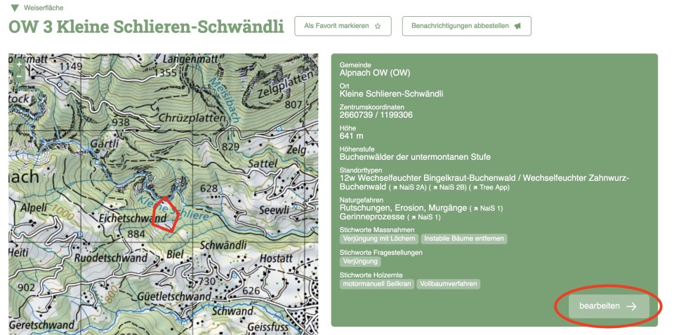 Im Bearbeitungsmodus, dem sog. Backend, können Sie Inhalte der Weiserflächen und Beobachtungspunkte anpassen und ergänzen. Es gibt zwei Varianten, in den Bearbeitungsmodus zu wechseln: