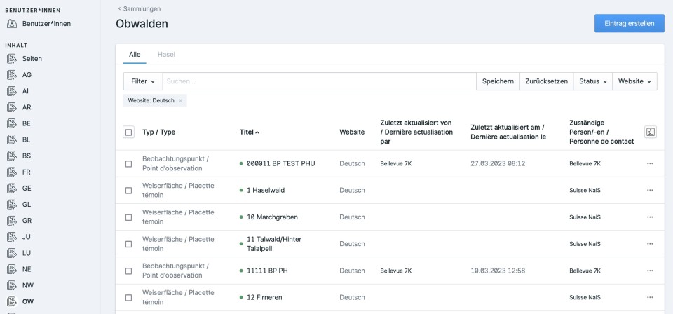 Wenn Sie von Ihrem Konto über Administration ins Backend wechseln, wird die Sammlung von Weiserflächen Ihres Kantons angezeigt. Mit der Schaltfläche Eintrag erstellen oben rechts können Sie eine neue Fläche eröffnen. Wählen Sie zuerst, ob es sich um eine Weiserfläche oder einen Beobachtungspunkt handelt und füllen sie die obligatorischen Inhalte auf der Seite Basisdaten aus (Nummer und Name, mit rotem * markiert) und speichern Sie ein erstes Mal.