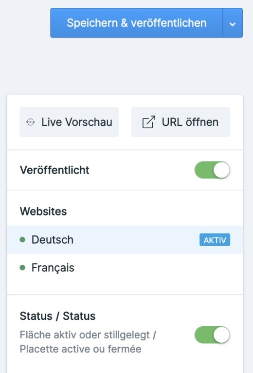 Speichern & veröffentlichen: Speichert Ihre Eingaben und veröffentlicht diese im Frontend. Über das kleine Dreieck rechts der Schaltfläche können Sie das Verhalten beim Speichern wählen. Alternativ kann auch mit der Tastenkombination Ctrl+S bzw. ⌘+S gespeichert werden.