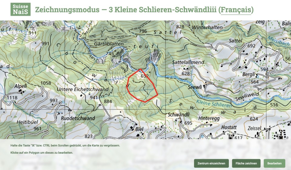 Fläche zeichnen: Ein Klick in die Karte fügt einen neuen Eckpunkt ein, mit Doppelklick schliessen Sie die Fläche ab. Mit Bearbeiten können einzelne Eckpunkte verschoben werden (Polygon zuerst durch Klick auf eine der Linien aktivieren). Änderungen werden erst nach dem bestätigen gespeichert.