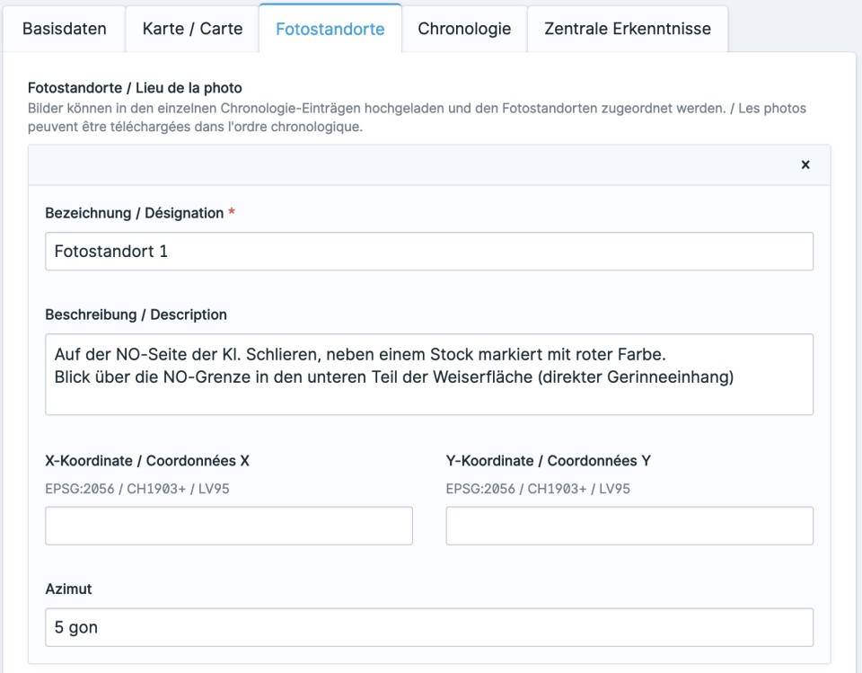 Es wird empfohlen, auf Weiserflächen Fotostandorte einzurichten, von denen aus bei den Begehungen jeweils Bilder in die gleiche Richtung gemacht werden, um die Entwicklung des Bestandes über die Zeit gut verfolgen zu können. Im Tab Fotostandorte können die eingerichteten Fotostandorte dokumentiert werden. Die an den entsprechenden Standorten gemachten Aufnahmen werden bei den Chronologieeinträgen hochgeladen (siehe Abschnitt Chronologieeinträge - Fotos) und können dort einem der Fotostandorten zugewiesen werden. Im Frontend können die Bilder dann im Fototool nach Fotostandort gefiltert werden.