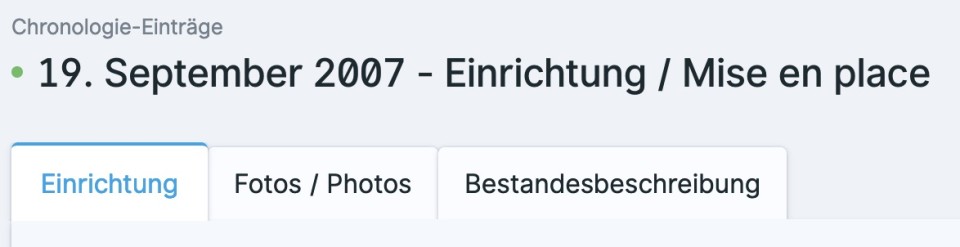 Öffnen Sie einen neuen oder bestehenden Chronologieeintrag, erscheint eine Seite mit drei Tabs: Spezifische Angaben je nach Chronologietyp, Fotos und Bestandesbeschreibung. Die letzten beiden Tabs sind bei allen Chronologietypen identisch und werden weiter unten separat erläutert. Obligatorische Eingabefelder sind jeweils durch einen roten Stern * markiert.