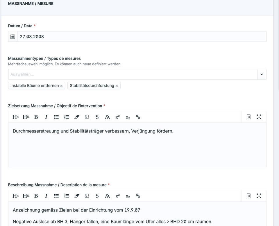 Hier können Sie auf der Fläche ausgeführte Massnahmen wie folgt dokumentieren: