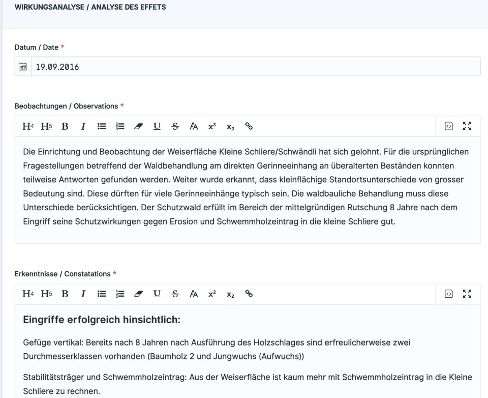 Zentrales Instrument für die Wirkungsanalyse ist das Formular 5. Der wichtigste Teil der Wirkungsanalyse folgt jedoch erst danach: Welche Schlussfolgerungen können gezogen werden? Was bedeutet das für ähnliche Schutzwälder? Legen die Erkenntnisse gar nahe, dass bestehende Grundlagen oder Lehrmeinungen angepasst werden sollten? Die Kernaussagen zu diesen Fragen sollten in Kurzform direkt in SuisseNaiS erscheinen.