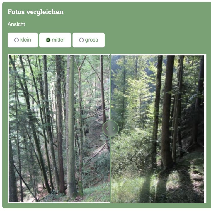 Die Funktion zum Vergleich auswählen (oberhalb jedes Bildes im Fototool) erlaubt es, zwei beliebige Bilder auszuwählen, die danach in einer neuen Ansicht überlagert werden und mit einem Schieber verglichen werden können. Diese Funktion ist von Nutzen, wenn mehrere Aufnahmen von einem Fotostandort konsistent durchgeführt wurden.