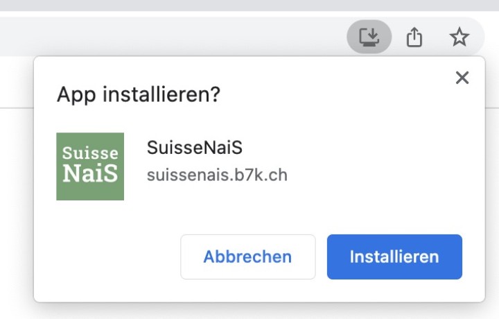 Auf Laptops und Desktop PCs können Sie SuisseNaiS mit dem Browser Google Chrome speichern. Dazu klicken Sie auf das entsprechende Symbol rechts in der Adresszeile und wählen dann Installieren.