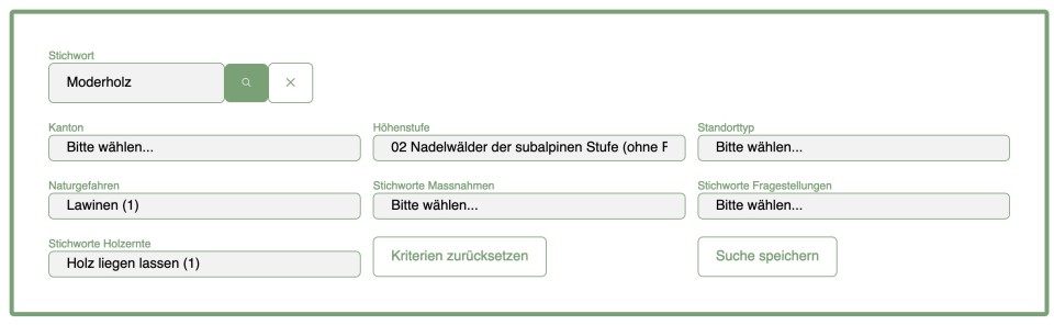 Die Stichwortsuche durchsucht alle auf der Plattform erfassten Informationen inkl. hinterlegter PDF-Dateien. Die Sucheingabe ist mit Enter oder Klick auf das Lupensymbol zu bestätigen. Mit den Drop-Down-Filtern (Kanton, Höhenstufe, Standorttyp, etc.) können die Suchresultate nach den entsprechenden Kategorien eingeschränkt werden. Die Zahlen in Klammern hinter den einzelnen Einträgen in den Drop-Down-Einträgen geben die Anzahl Flächen mit diesem Kriterium in Abhängigkeit der bereits gewählten Filter an. Die Stichwortsuche und die Drop-Down-Filter sind kombinierbar.