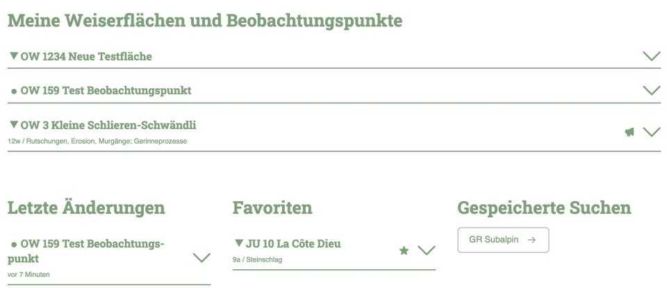Falls Sie einen Account haben und eingeloggt sind, erscheinen unterhalb der Karte Schnellzugänge zu verschiedenen Flächengruppen. Unter Meine Weiserflächen und Beobachtungspunkte sind diejenigen Flächen aufgelistet, bei denen Sie Bearbeitungsrechte haben. Unter Letze Änderungen sind die letzten Flächen auf der gesamten Plattform aufgelistet, an denen Änderungen vorgenommen wurden (auch ohne Account sichtbar). Weiter sind die eigenen Favoriten und Gespeicherte Suchen aufgeführt. Das Hinzufügen von Favoriten und Suchen ist weiter unten erläutert.