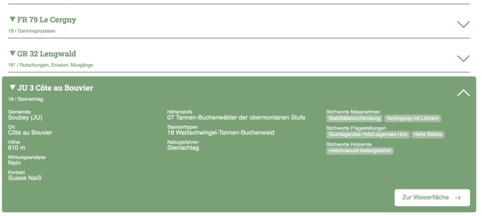 Die den Suchkriterien entsprechenden Flächen werden als sog. Akkordeons angezeigt, die standardmässig zugeklappt sind. Ein Klick auf den Titel öffnet das entsprechende Akkordeon und weitere Informationen zur Fläche werden angezeigt, inklusive diejenigen Dokumente, in denen die entsprechenden Suchbegriffe gefunden wurden. Dies erlaubt es Ihnen, mehrere Suchresultate auf einen Blick miteinander zu vergleichen um so möglichst effizient zur gewünschten Fläche zu kommen. Ein Klick auf Zur Weiserfläche resp. Zum Beobachtungspunkt öffnet die Detailseite der entsprechen Fläche.