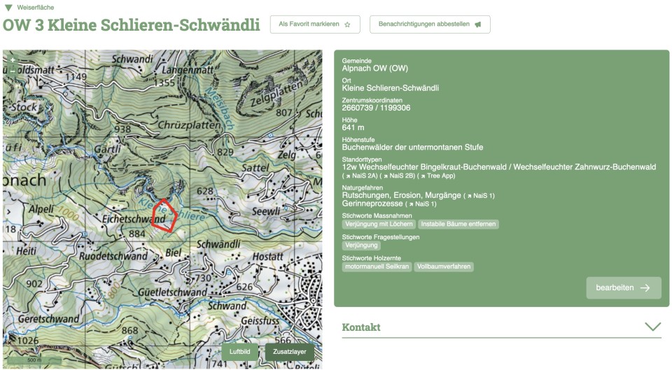 Zuoberst, neben der Flächenbezeichnung, kann man die Fläche als Favorit markieren und Benachrichtigungen abonnieren.