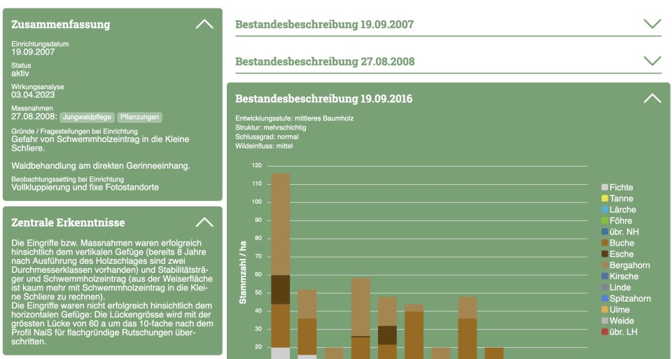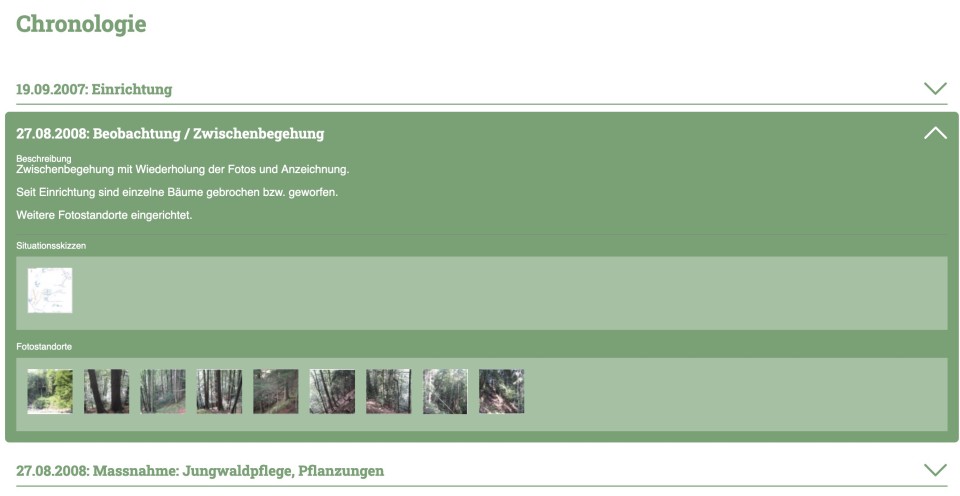 Für jede dokumentierte Begehung der Fläche erscheint hier ein Chronologieeintrag. Es gibt vier Typen von Einträgen: Einrichtung, Beobachtung / Zwischenbegehung, Massnahme und Wirkungsanalyse. Innerhalb jedes Eintrages können Informationen als Text (strukturiert in Anlehnung an die NaiS-Formulare), Links zu externen Seiten, weiterführende Informationen in Dokumenten sowie Bilder (z.B. Fotos oder Skizzen) erfasst sein. Die Bilder werden in folgende Kategorien unterteilt (sofern vorhanden): Situationsskizzen, Fotostandorte, Bestandesbilder, Luftbilder, Störungsereignisse, Bodenprofil, Gegenhangansicht, sonstiges und Orientierungshilfen. Ein Klick auf eines der kleinen Vorschaubilder öffnet eine Lightbox mit dem Bild in voller Auflösung.