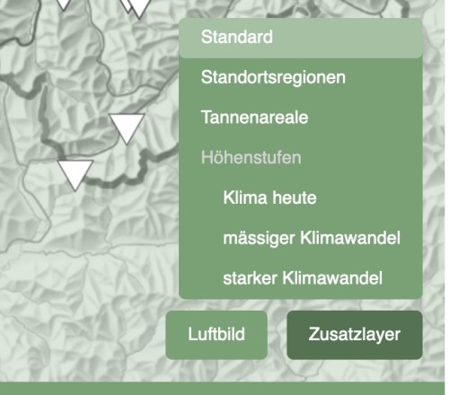 Auf der Startseite sehen Sie auf der interaktiven Karte alle erfassten Weiserflächen und Beobachtungspunkte. Wird ein Symbol angeklickt, erscheinen Flächenname, Waldgesellschaft und Naturgefahr in einer Sprechblase, über die Sie direkt zur Detailseite für die entsprechende Fläche gelangen. Unten rechts kann der Hintergrund von der Landeskarte (Standard) zum Luftbild gewechselt werden, sowie eine Reihe von Zusatzlayern eingeblendet werden (Standortsregionen und Tannenareale gemäss NaiS sowie die modellierten Höhenstufen unter heutigem und künftigem Klima, siehe Abbildung rechts).