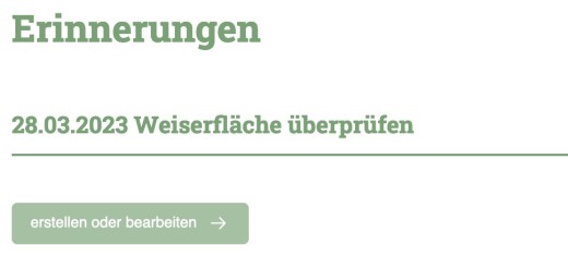 In diesem Abschnitt werden Erinnerungen angezeigt, die man selber generiert hat (z.B. Erinnerung für eine erneute Begehung einer Weiserfläche). Erinnerungen kann man nur für sich selber erstellen. Nebst der Anzeige auf dieser Seite werden Sie auch per E-Mail über anstehende Erinnerungen informiert. Über die Schaltfläche erstellen oder bearbeiten gelangen Sie in den Einstellungsbereich für die Erinnerungen. Hier können Sie neue Erinnerungen erstellen, bestehende bearbeiten oder löschen. Um eine Erinnerung zu löschen, klicken Sie auf die drei Punkte ganz rechts und klicken auf Zeile löschen. Alle Änderungen müssen mit der Schaltfläche Speichern oben rechts bestätigt werden. Um den Einstellungsbereich zu verlassen, schliessen Sie den aktuellen Tab.