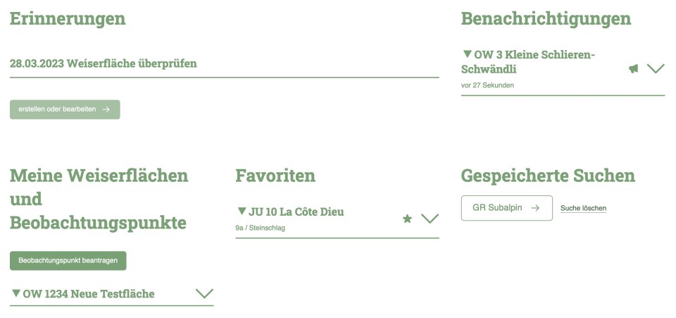 Unter Meine Weiserflächen und Beobachtungspunkte sind diejenigen Flächen aufgelistet, bei denen Sie Bearbeitungsrechte haben. Unter Gespeicherte Suchen haben Sie einen Schnellzugriff auf vordefinierte Suchkriterien und können diese bei Bedarf auch löschen.