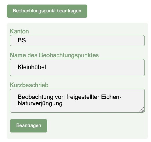 Alle Nutzenden mit einem Account können Beobachtungspunkte beantragen. Sie finden die entsprechende Schaltfläche unter Meine Weiserflächen und Beobachtungspunkte. Es öffnet sich ein kleines Formular, in dem Sie den Kanton wählen, in dem der Beobachtungspunkt liegt, einen Namen vorschlagen und eine kurze Beschreibung für den Grund und den Inhalt des Beobachtungspunktes erfassen können. Wenn Sie den Punkt beantragen, wird automatisch eine Meldung an den Administrator des entsprechenden Kantons ausgelöst, der Ihnen den Punkt eröffnen und Sie als Bearbeiter/in hinzufügen wird. Der Administrator wird der Fläche mindestens eine Nummer und einen Namen zuweisen. Insbesondere die Koordinaten des Beobachtungspunktes werden zu Beginn standardmässig auf das Zentrum des gewählten Kantons gelegt und müssen darum von Ihnen angepasst werden. Die weiteren Informationen können Sie dann mit Hilfe der Anleitung zur Bearbeitung von Flächen erfassen.