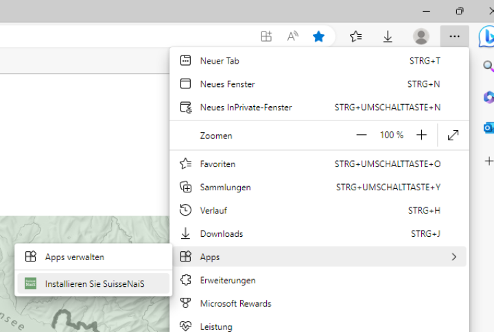 Auf Laptops und Desktop PCs können Sie SuisseNaiS mit dem Browser Microsoft Edge speichern. Dazu klicken Sie auf die drei Punkte oben rechts, wählen Apps und dann Installieren Sie SuisseNaiS