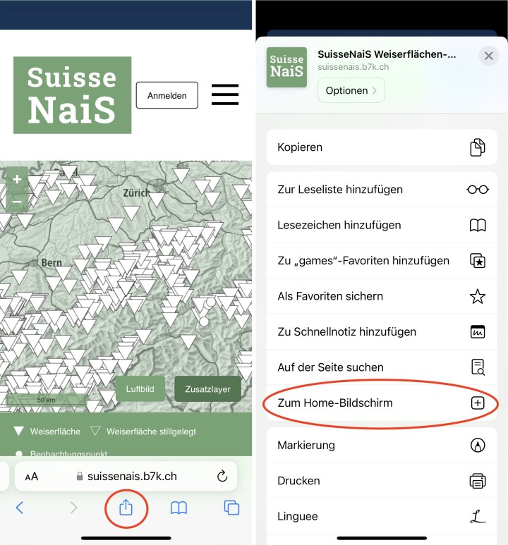 Auf iPhones und iPads öffnen Sie SuisseNaiS in Safari und drücken das im linken Bild rot markierte Symbol, scrollen runter und wählen Zum Home-Bildschirm.