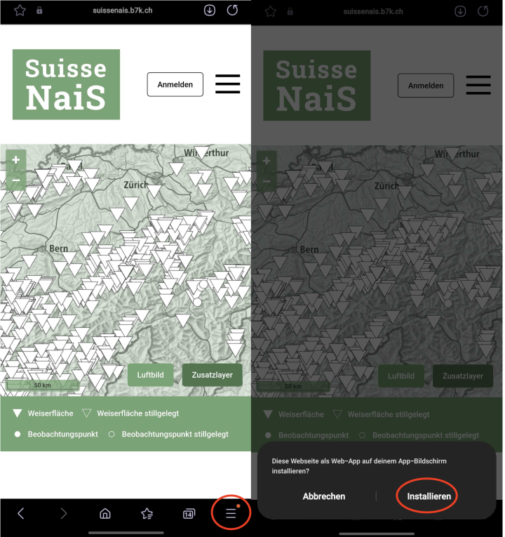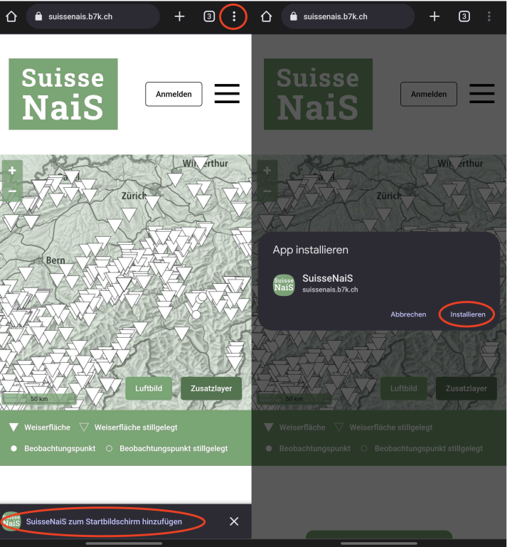 Auf mobilen Geräten mit Android, öffnen Sie SuisseNaiS in Chrome. Entweder werden Sie direkt gefragt, ob Sie SuisseNaiS zum Startbildschirm hinzufügen möchten (linker Screenshot, unten) und können dies mit Installieren bestätigen. Ansosten können Sie über die drei Punkte oben rechts (linker Screenshot, oben) das Menu öffnen und dort zum Startbildschirm hinzufügen auswählen.