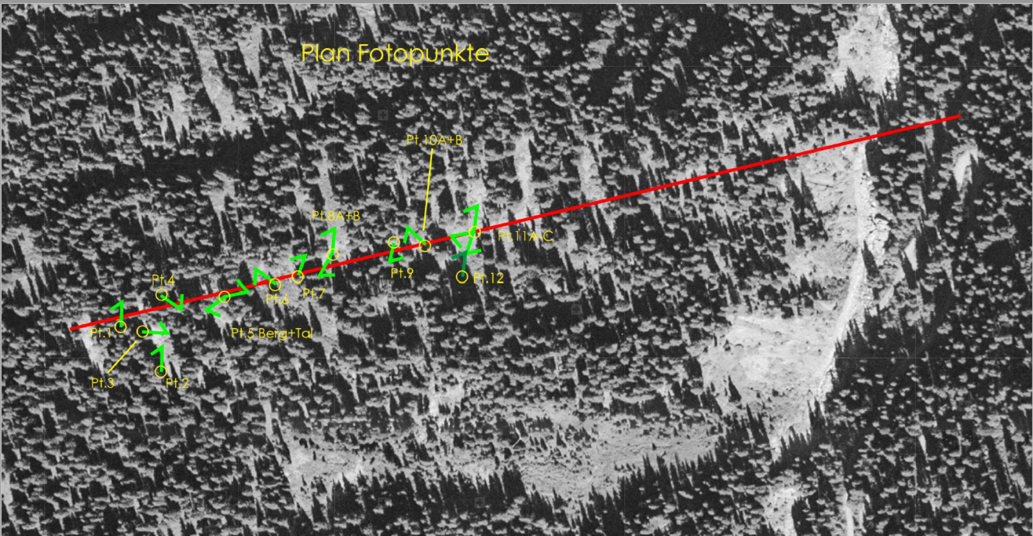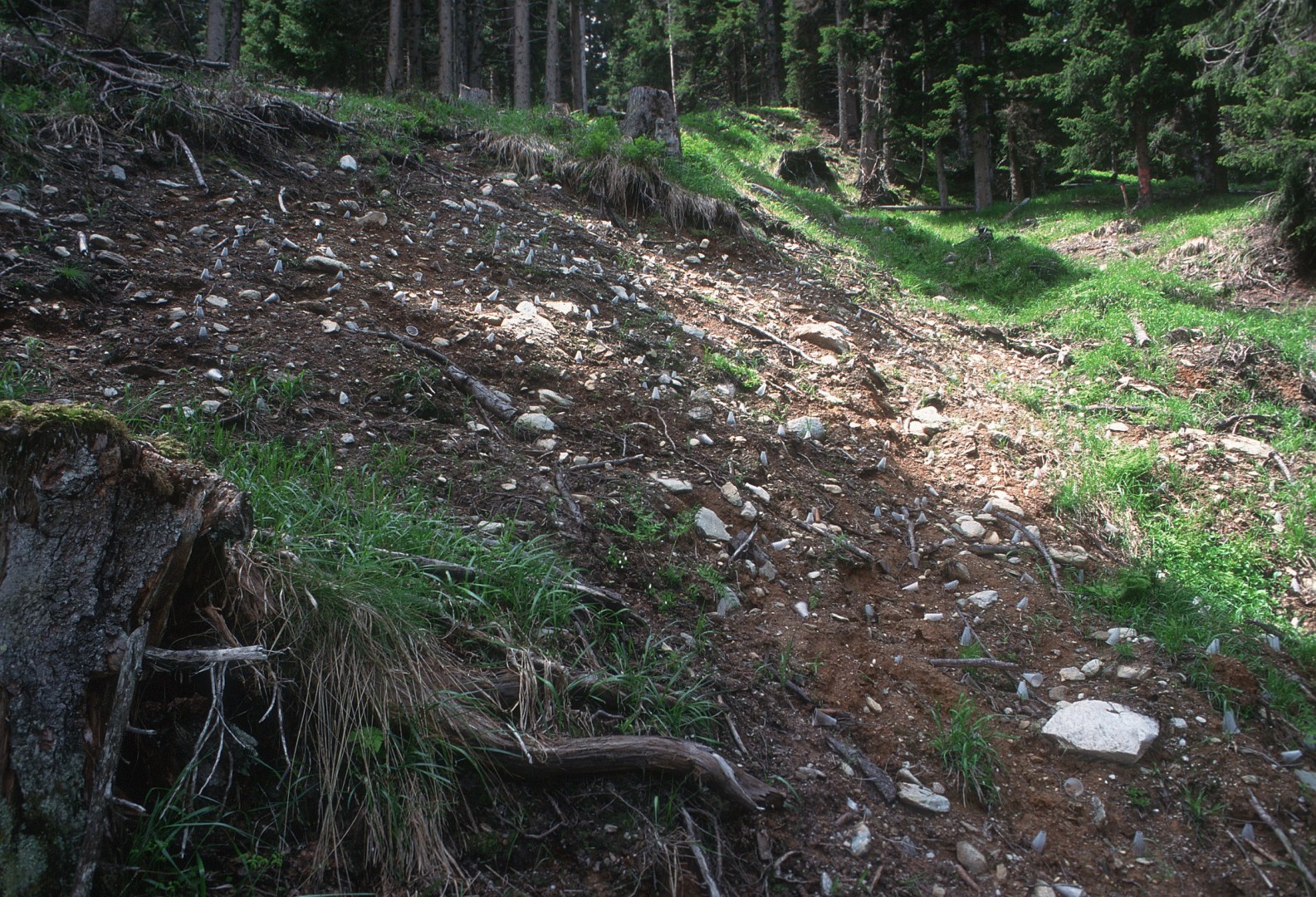 Versuch von, mit Cellulose-Hütchen geschützter, Saat auf Schürfflächen nach eingriff mit Seilkran.