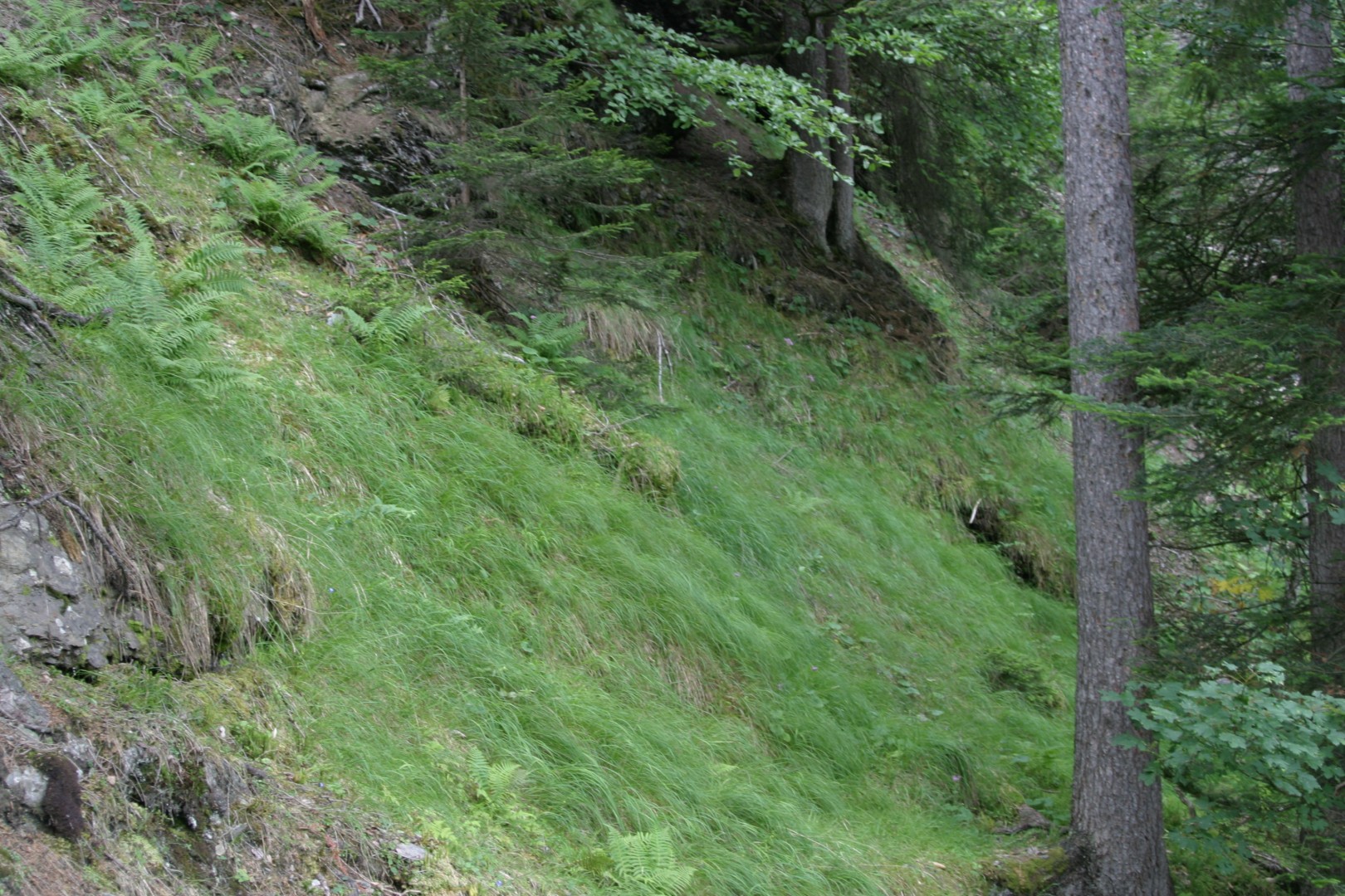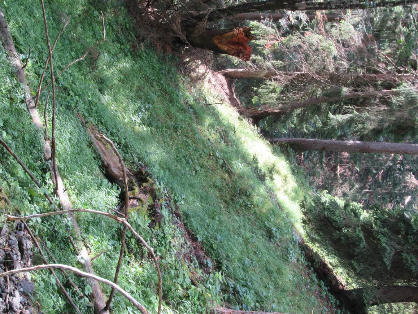 Bestand mit hoher BHD-Streuung. Nadelholzlastiger Bestand. In Zeiten des Klimawandels wäre ein erhöhter Laubholzanteil im Altbestand und in der Verjüngung wichtig. Im Einfluss der Bäche verjüngungsfeindliche Bodenbedeckung mit Reitgras.