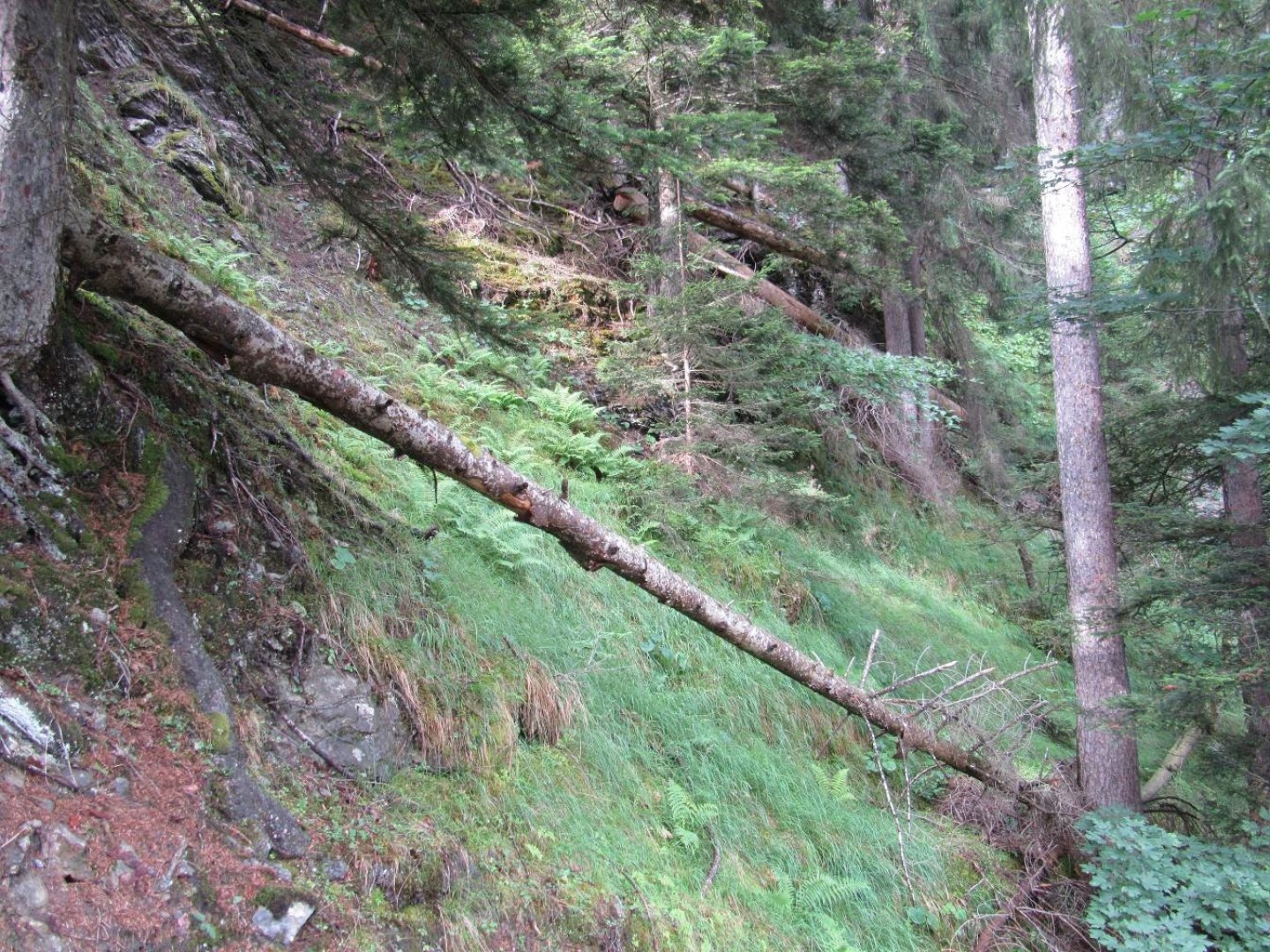 Dank Querbäumen kann die Einleitung der Verjüngung ohne Verringerung des Schutzdefizites erfolgen. Gemäss Zeichen im Bestand ist der Steinschlag nicht sehr aktiv in diesem Gebiet.