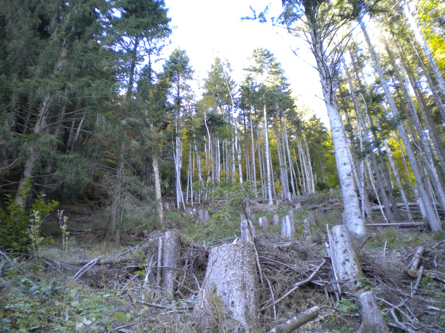 Unterschiede an Tannen (3-5m), welche beim Holzschlag begünstigt wurden und jenen unter Schirm ist gut auffällig