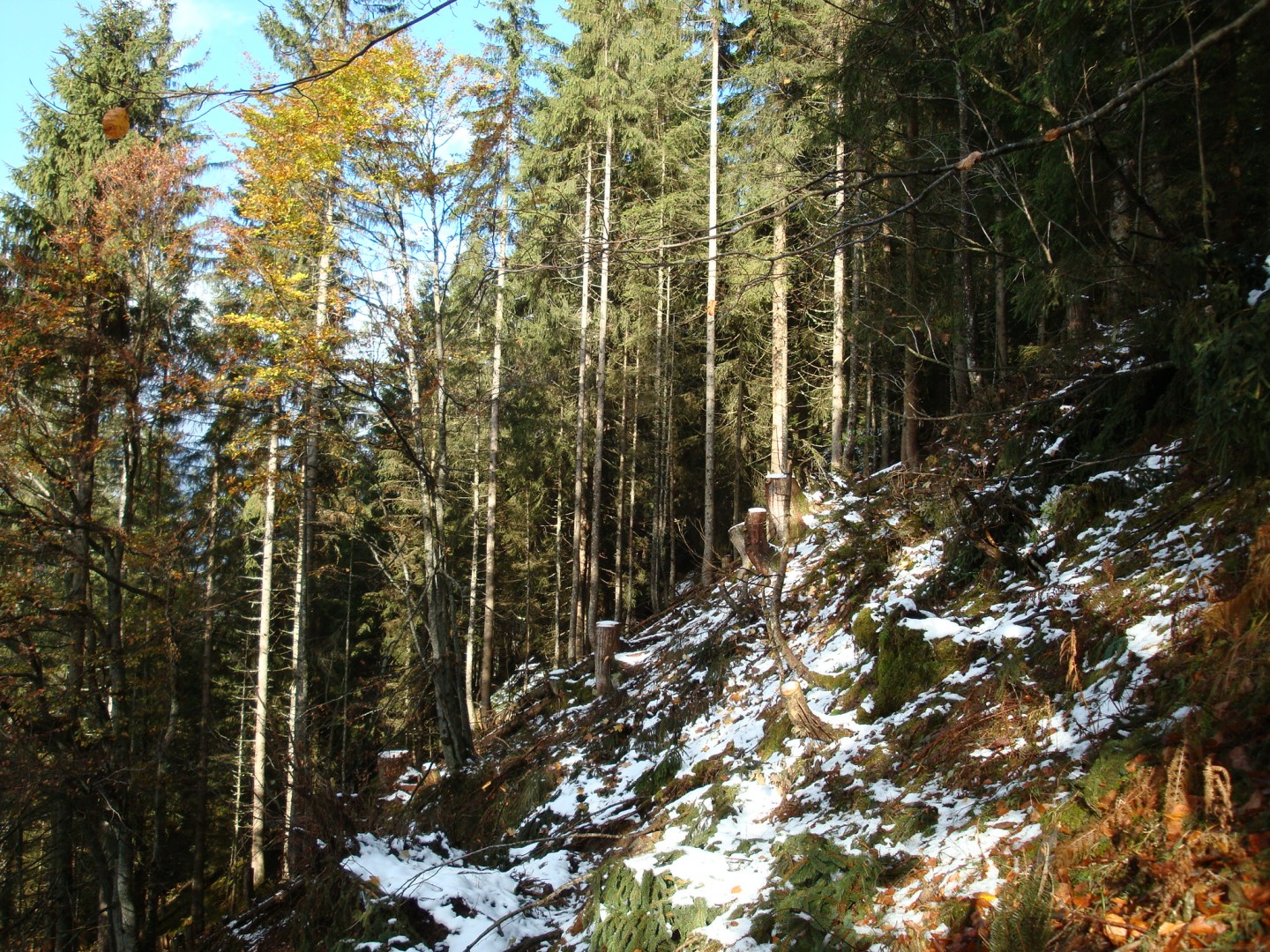 das Totholz wurde durchverschiedene Eingriffe liegengelassen. so kann es sich nun zu Moderholz entwickeln und kann nun in der Zukunft Keimmöglichkeiten für die Naturverjüngung darbieten. Es ist Verjüngung vorhanden; doch ein grosser Teil davon wurde durch Pflanzung eingeführt (nicht durch Naturverjüngung). Es ist auch zu vermerken, dass ein grosser Teil der Verjüngung Verbissspuren aufweist. Nur mit den durchgeführten Massnahmen kann das Aufkommen der Naturverjüngung nicht gesichert werden; aufgrund des hohen Wilddruckes.