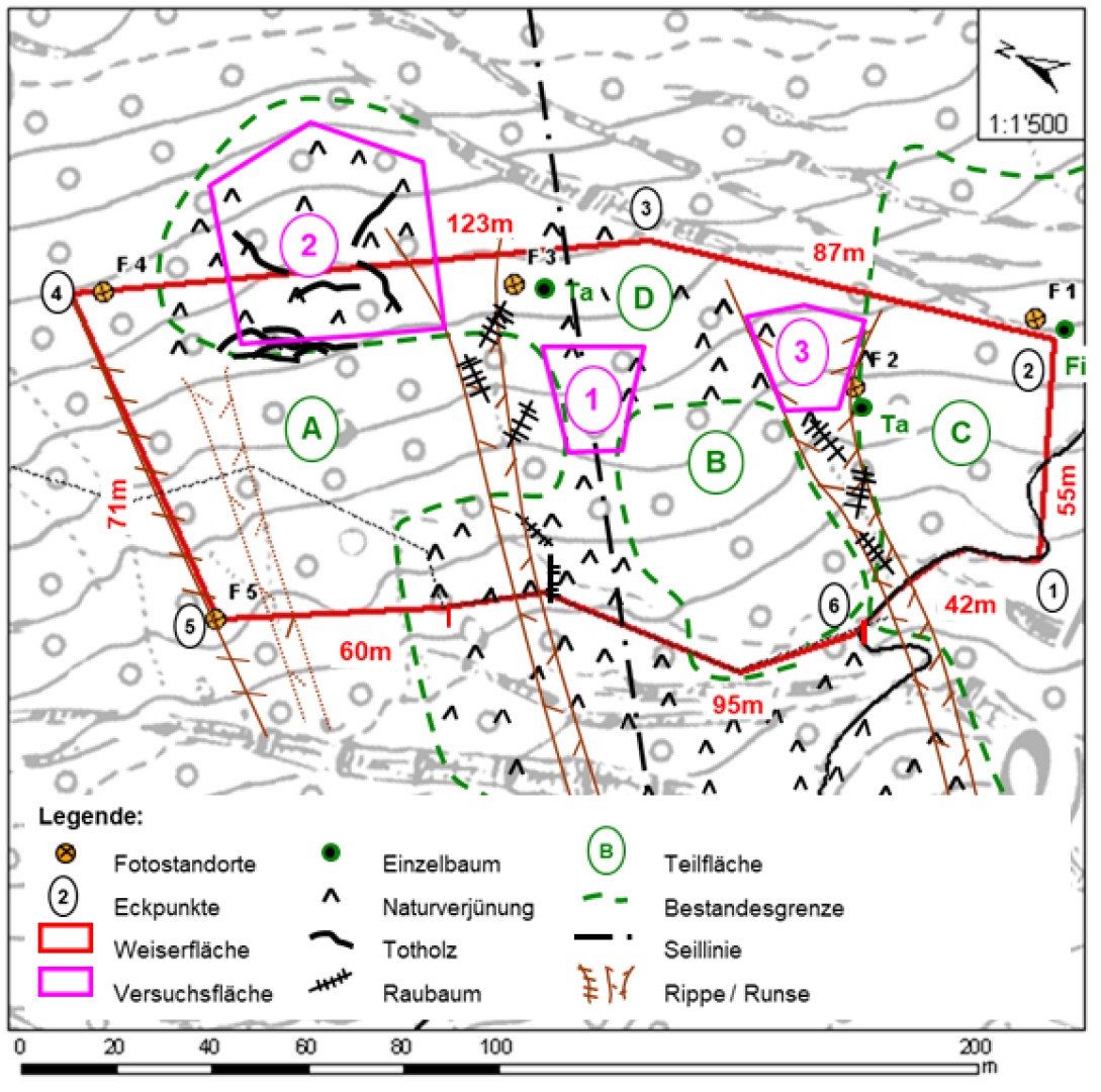 Die Weiserfläche wird durch zwei Schneisen in drei Bestände unterteilt (vgl. Situationsskizze, Teilbestände A, B und C). Für die Beurteilung nach NaiS (Formular Nr. 2) wurden der Bestand A separat beurteilt. Die Bestände B, C und die Naturverjüngungsflächen wurden zusammenfassend beurteilt.