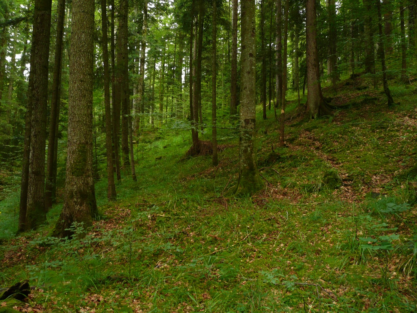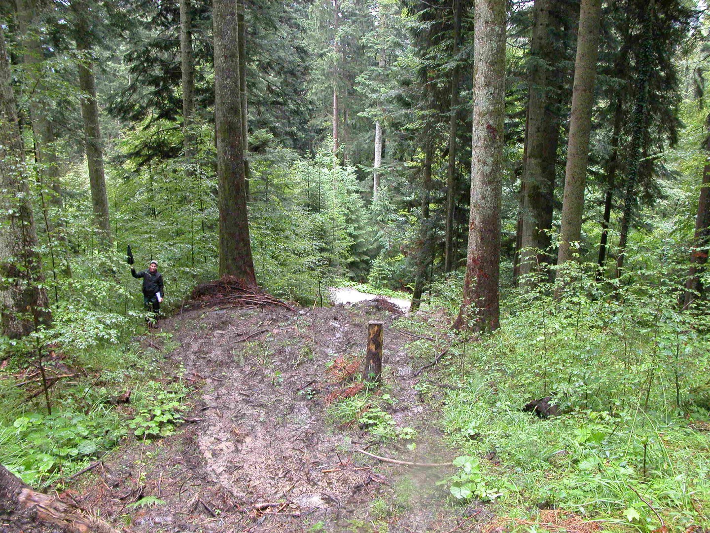 Die Fläche weist mehrere Spuren von Rutschungsaktivitäten auf, v.a. immer schräger werdende Bäume.