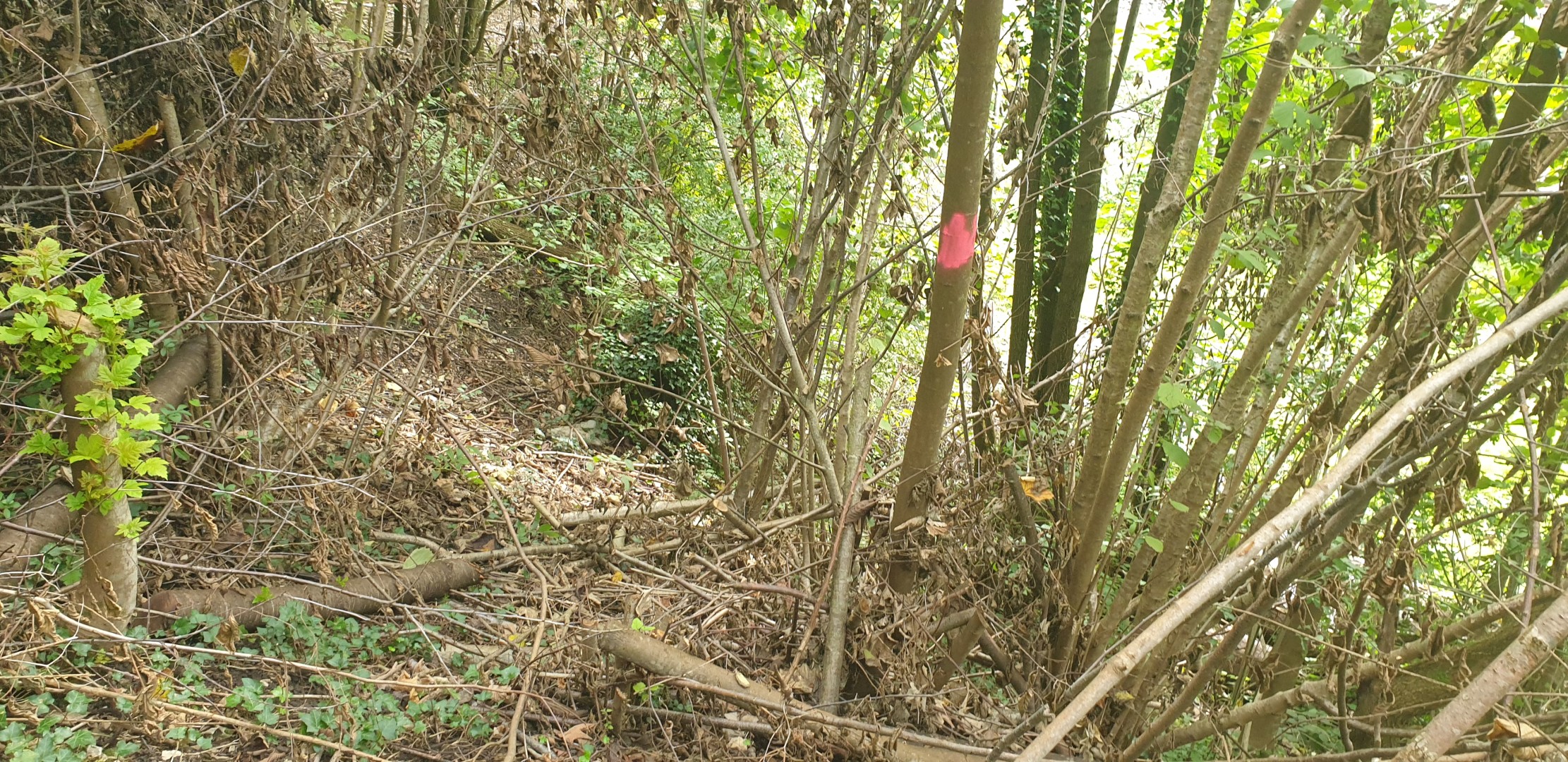 L'image du peuplement a fortement changé. Après la coupe, il ne reste plus qu'un fourré assez disséminé et quelques gros bois en dessous du chemin (B). Force et de constater qu'après une année, le fourré réagit déjà positivement. Il est prévu de maintenir la forêt au stade du fourré, si possible avec la méthode du taillis