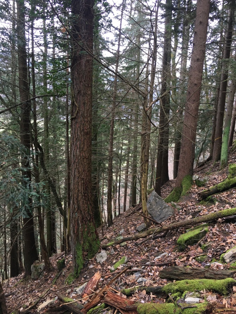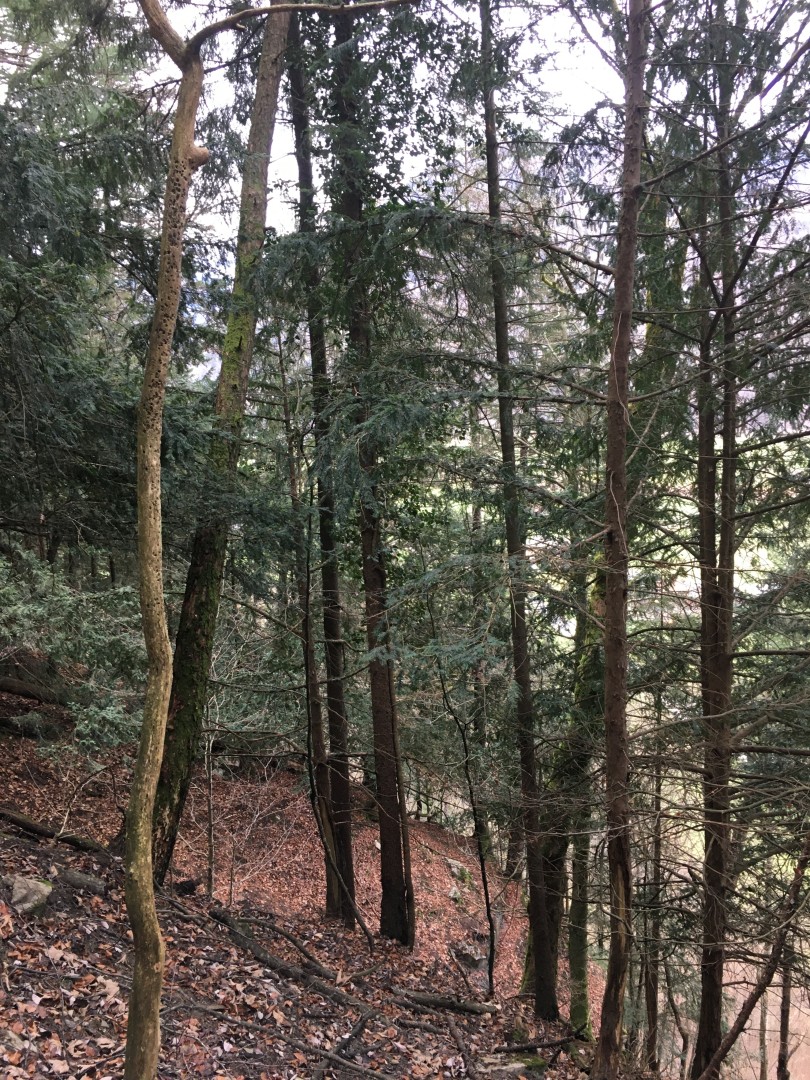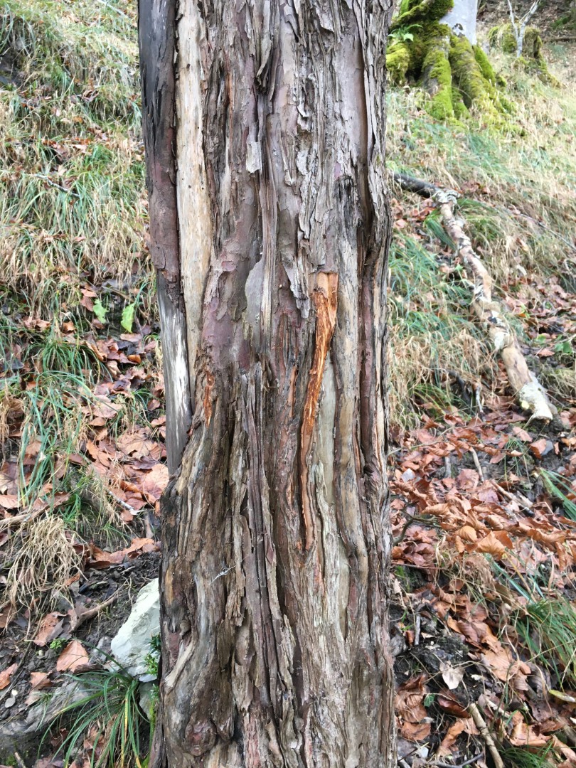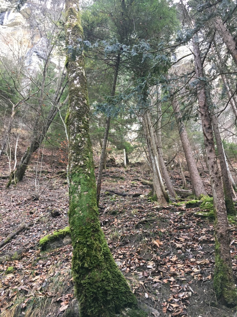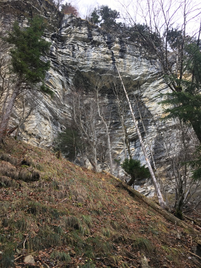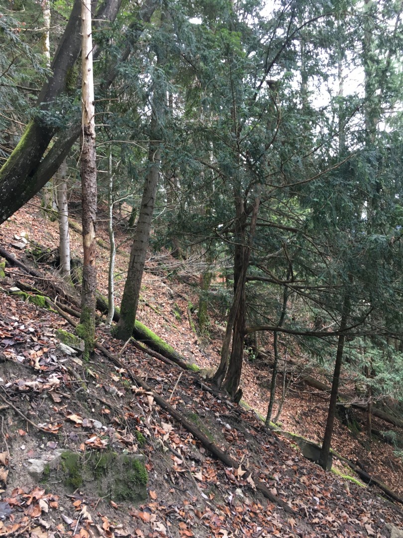• Einige wenige Eiben konnten sich erholen, haben die massiven Schälschäden überlebt, diese durchwurzeln einen grossen Teil des Oberhangs (direkt unter der Felswand)