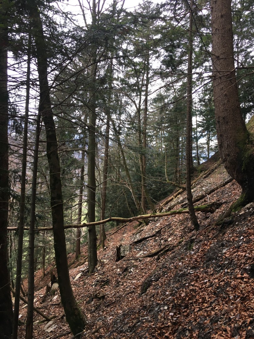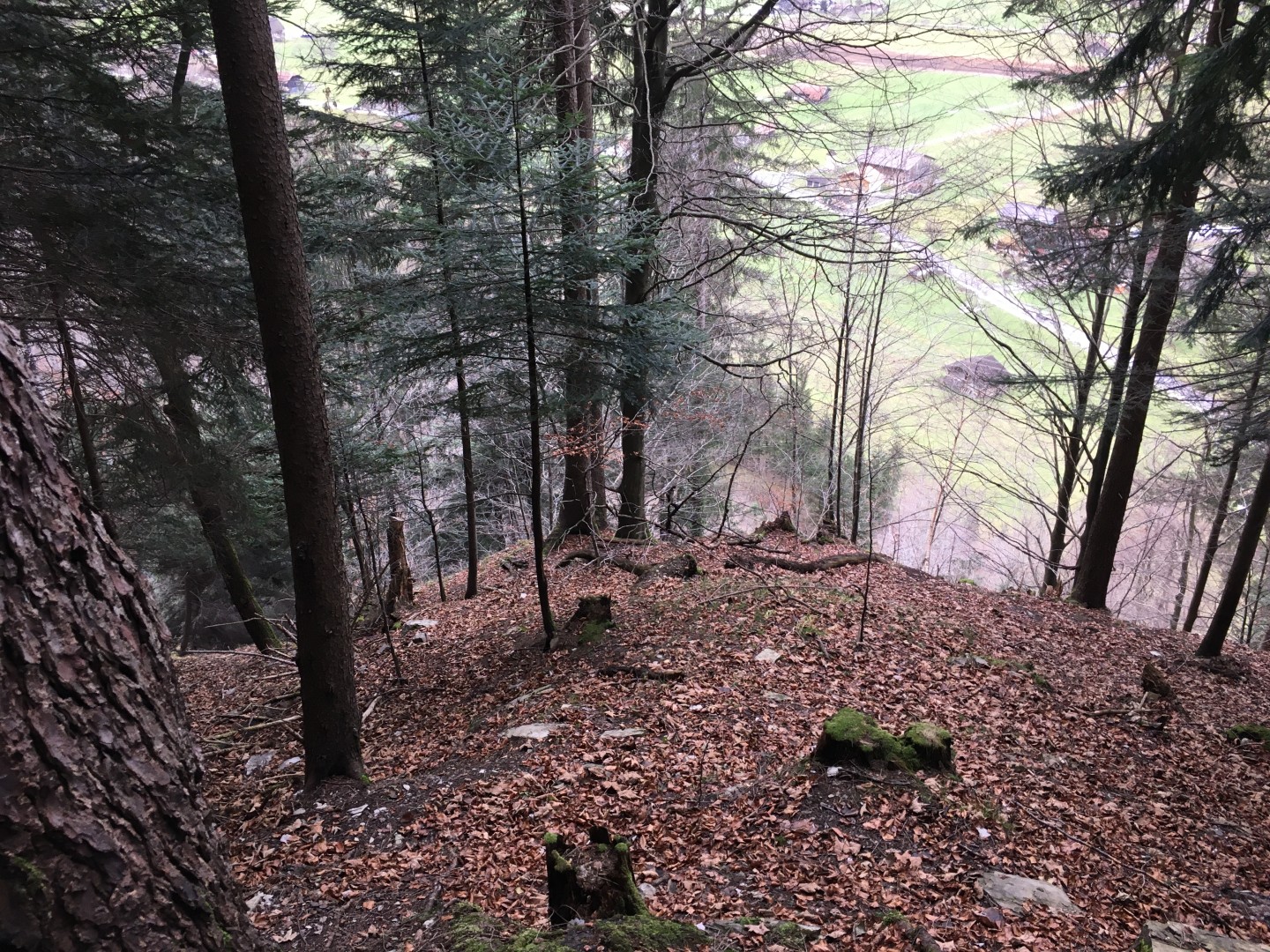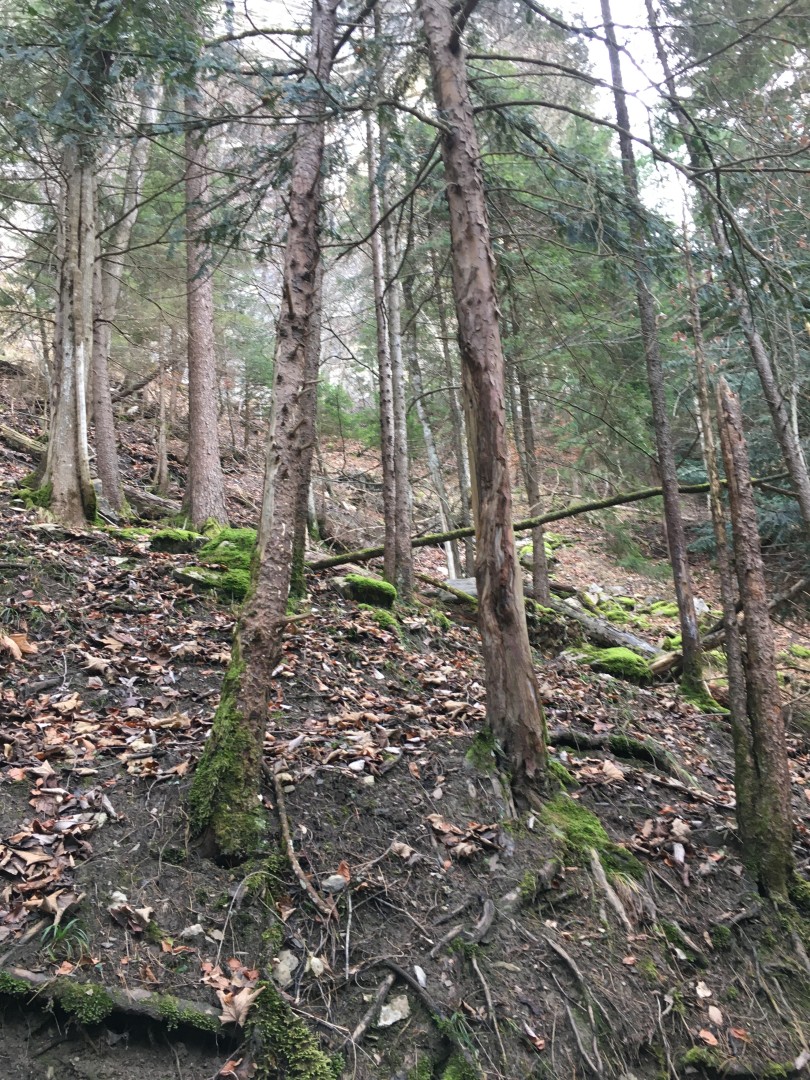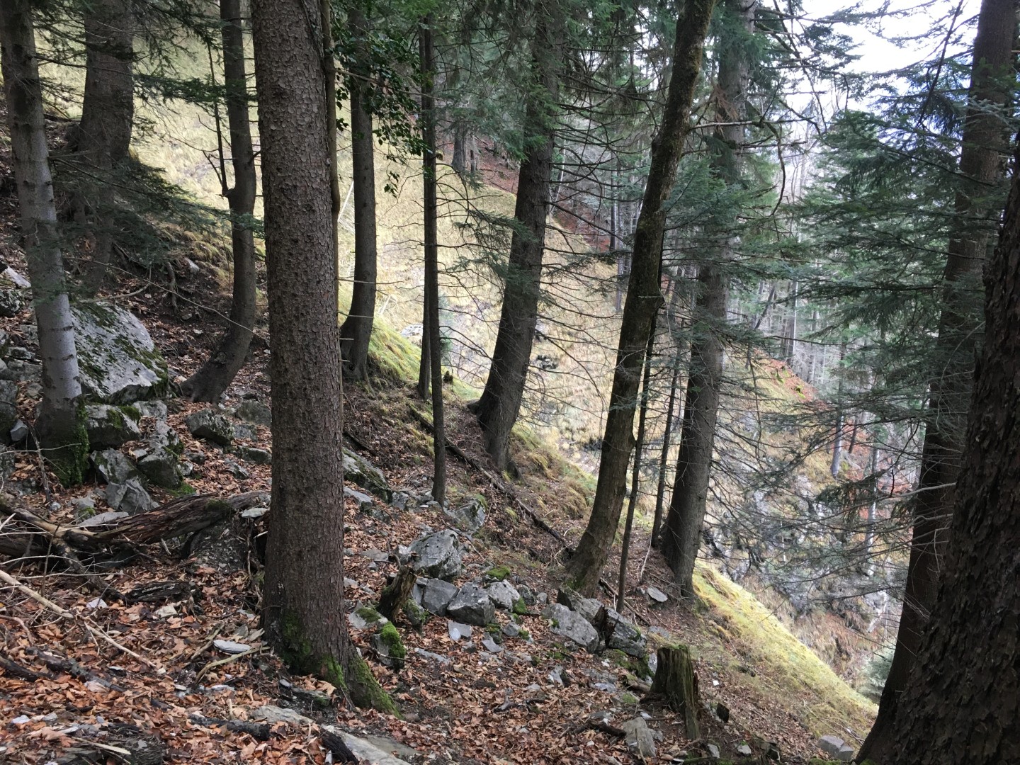 • Es ist sehr schwierig für die Bäume auf der Fläche anzuwachsen, es gibt zu wenige geeignete Kleinstandorte und zu viele erschwerende Einflüsse (Gefälle, Steinschlag, Wild, Schnee?)