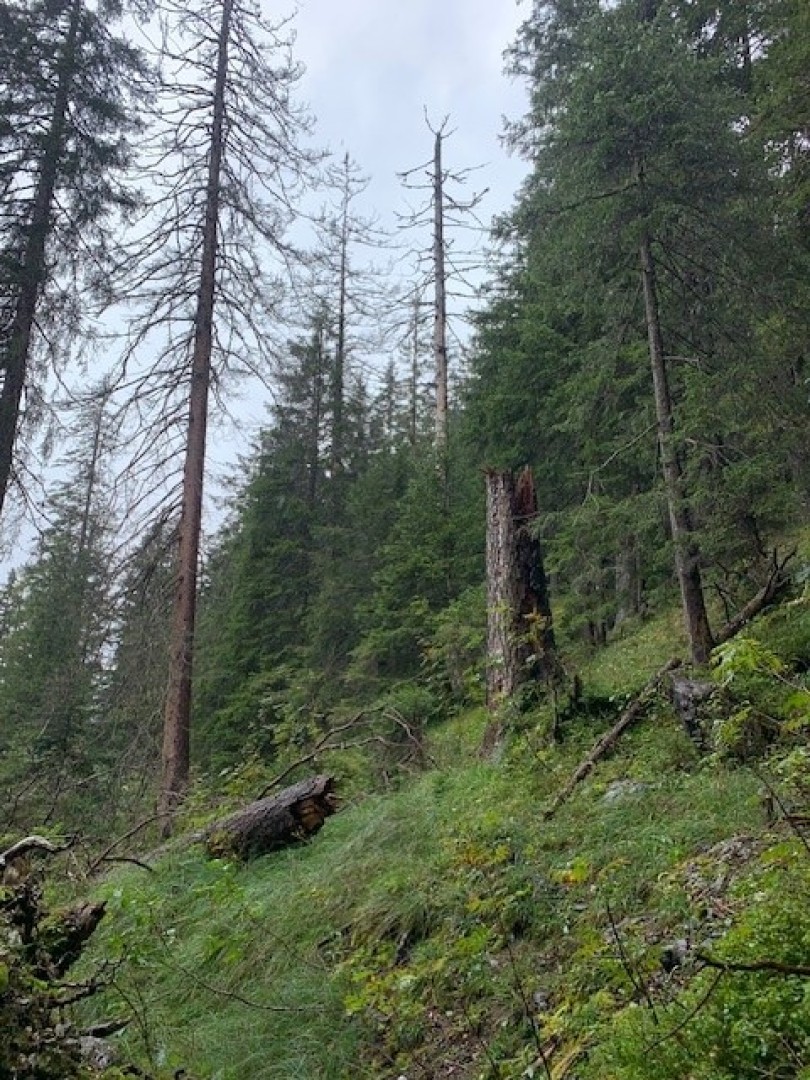 Totholz: Zunahme Totholz durch abgehende Fichten wird sicher weitergehen und das liegende Totholz wird weiterhin eine wichtige Funktion für die Verjüngung und den Steinschlagschutz übernehmen.