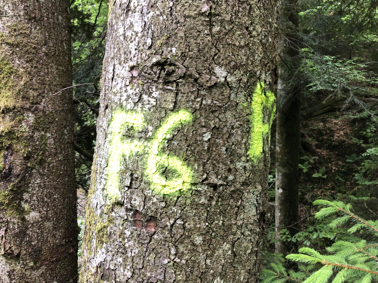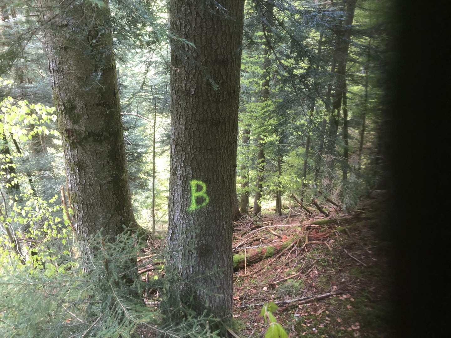 Folgeaufnahme durchgeführt. Feststellungen: Die starke Tanne auf der Foto F7 138 ist vom Krummzähnigen Tannennborkenkäfer befallen und bereits dürr.