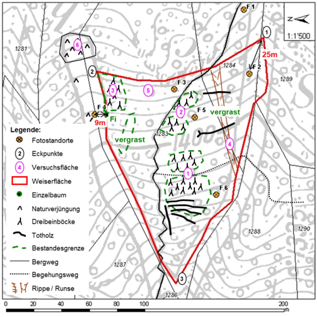 Im Gebiet der Schwändeliflue sind immer wieder ähnliche Situationen anzutreffen wie auf der Weiserfläche. Die vor kurzem ausgeführten und gut dokumentierten Massnahmen sowie die verhältnismässig gute Erreichbarkeit machen die Fläche zum geeigneten Objekt, um die Wirksamkeit der getroffenen Massnahmen im Hinblick auf die Bewirtschaftung der übrigen Bestände an der Schwändeliflue zu beurteilen.